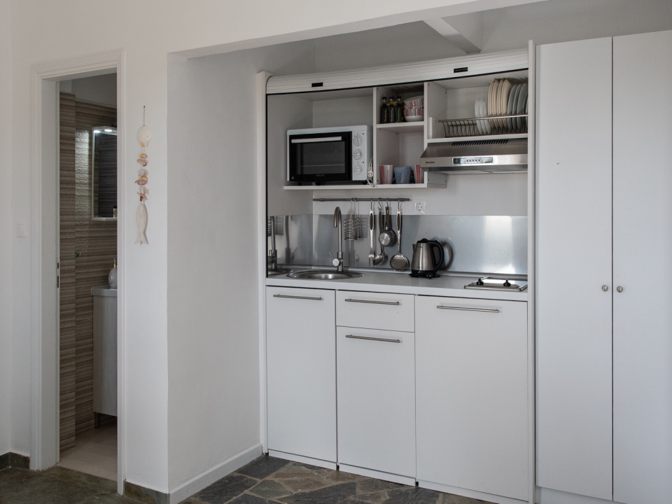 It is a studio for 2 people with two single beds. Its design, both interior and exterior is based on cycladic architecture.